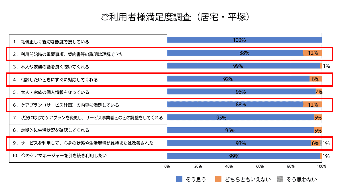 すべての質問をとおして、「そう思う(満足)」とのご回答を、訪問看護では8割以上、居宅介護支援センターでは9割以上の方にいただきました。ご利用者様、ご家族様にとても高い評価をいただけたことに感謝いたします。